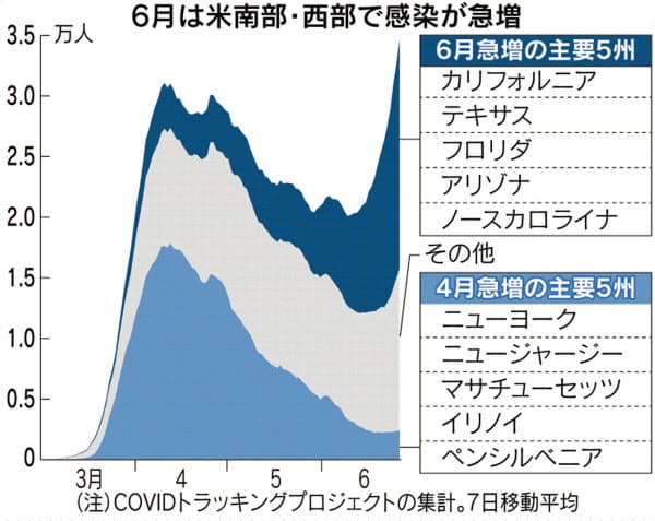 3~4月の感染爆発はニューヨーク州など東海岸が中心だった。数カ月の厳しい外出規制で東海岸は5月以降、新規感染は右肩下がりとなった。6月の急増は南部や西部が主導する。5月初めの経済再開や5月下旬以降の黒人差別デモで、人の接触が増えたことが背景とみられる。カリフォルニア州など急増が目立つ主要5州の6月の累計感染者は30万人を超え、5月の2倍以上となった。
