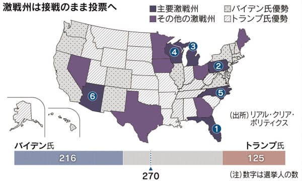 【ワシントン=永沢毅】米大統領選は共和党候補のトランプ大統領が一部の激戦州で猛追するなかで3日の投票日を迎える。民主党候補のバイデン前副大統領は共和党の地盤にも侵食しつつある。支持率が拮抗する中西部や南部の10あまりの州が勝敗を左右し、なお予断を許さない。