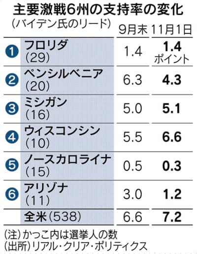 ほぼ一進一退の中西部ウィスコンシン、同ミシガンの含む主要な激戦6州でのバイデン氏のリードは、10月中旬にいったん5ポイントまで差が開いたが、11月1日時点で3.3ポイントまで縮んだ。
