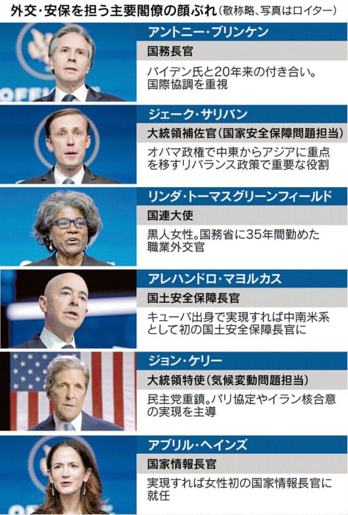 外交のかじ取り役を担う国務長官に指名するアントニー・ブリンケン氏はオバマ前政権で国務副長官を、大統領補佐官に起用するジェーク・サリバン氏はバイデン副大統領(当時)の国家安保担当補佐官をそれぞれ務めた。バイデン氏は地元の東部デラウェア州で会見し「このチームはかつての米国が戻ってきたことを示している」と述べ、国際社会の指導的地位に復帰する決意を示した。