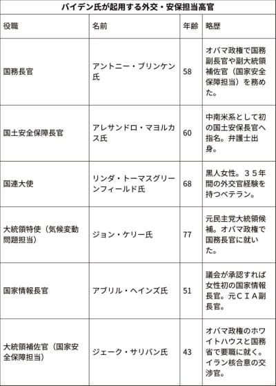 バイデン氏の人選は性別や人種の多様性も意識している。23日に公表した6人の高官のうち、女性は2人。黒人、キューバ系のヒスパニックがそれぞれ1人ずつだった。