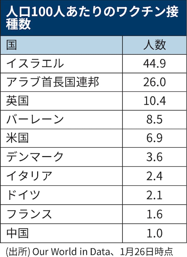 26日時点の集計によると、人口100人あたりの接種人数はドイツで2.1人、フランスで1.6人にとどまる。世界で先行するイスラエル(44.9人)や英国(10.4人)などに対し見劣りは否めない。