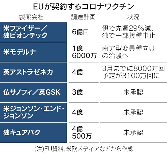 EUは12月末からファイザー製、1月にモデルナ製のワクチン接種を始めた。供給の遅れが続けば、夏までに成人の7割に接種する計画にも暗雲が漂う。