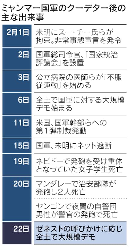 【ヤンゴン=新田裕一、ブリュッセル=竹内康雄】ミャンマーの国軍に対するデモは22日、大規模なゼネストに発展した。国軍は欧米の制裁を警戒しデモ対応に苦慮している。ただ1988年のゼネストでは国軍が無差別発砲して多数の死傷者が出ており、緊張が高まっている。