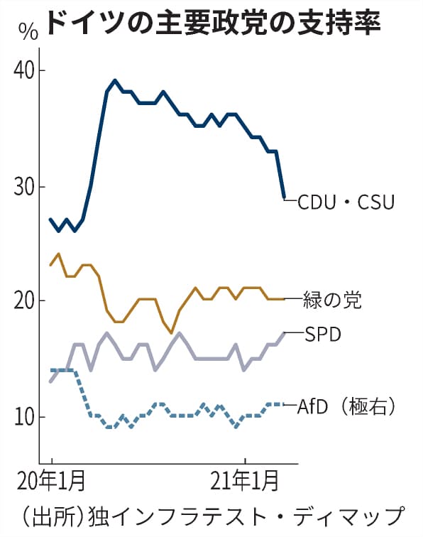 CDU・CSUは議員がマスク取引で利益を得ていたという疑惑が浮上し、14日の2つの州議選で惨敗したばかりだ。9月の選挙までにコロナ封じのめどを付け、有権者の支持を取り戻せるかが焦点となる。