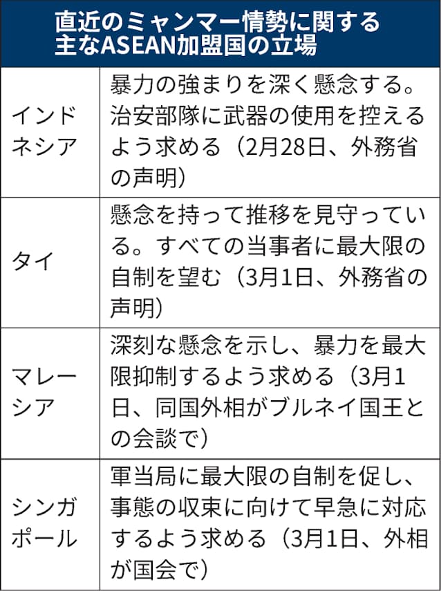 【ジャカルタ=地曳航也、ヤンゴン=新田裕一】ミャンマー国軍が起こしたクーデターを巡り、東南アジア諸国連合(ASEAN)は2日、オンライン形式で非公式の外相特別会議を開いた。会議後、議長国のブルネイは、デモで死傷者が出ているミャンマーの情勢に懸念を示し、すべての当事者に暴力の自制を求める議長声明を発表した。