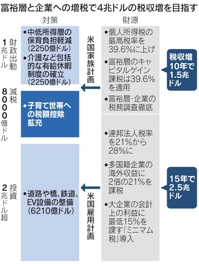 【ワシントン=大越匡洋】バイデン米政権は28日、主に個人富裕層への増税を財源に育児や教育を支援し、格差の是正をめざす新たな経済政策構想「米国家族計画」をまとめた。10年間で1.5兆ドル(約160兆円)の税収増を見込み、計画の財政規模は減税分を含めて1.8兆ドルを想定する。増税に野党の反発は強く、実現へ難航は必至だ。