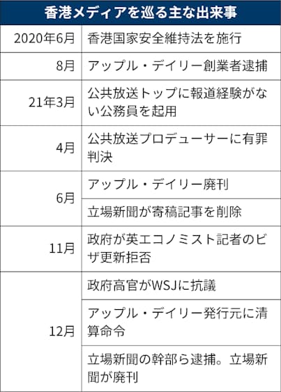 21年3月、当局への批判も辞さない姿勢で知られた公共放送・香港電台(RTHK)のトップに報道経験がない公務員が就き、4月には警察批判の番組を手掛けたプロデューサーに有罪判決が下った。蘋果日報の幹部が次々と逮捕され、同紙は6月に廃刊に追い込まれた。